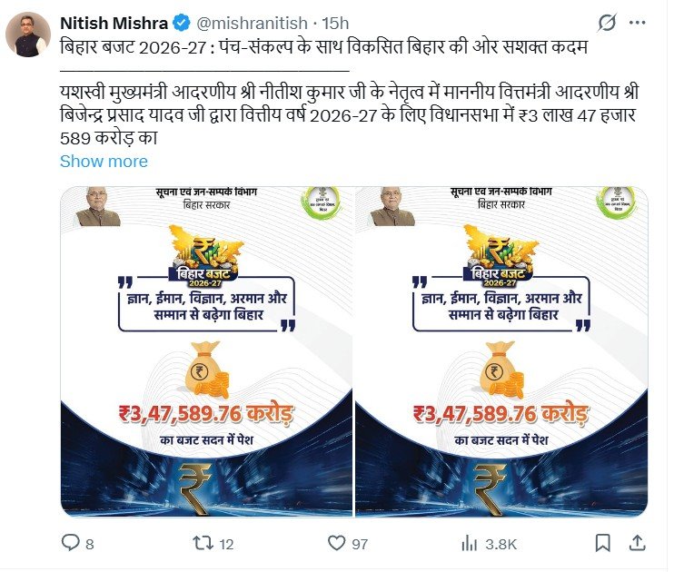 बिहार के मुख्यमंत्री आदरणीय नीतीश कुमार के नेतृत्व में वित्त मंत्री बिजेन्द्र प्रसाद यादव ने विधानसभा में वित्तीय वर्ष 2026-27 के लिए ₹3 लाख 47 हजार 589 करोड़ का बजट पेश किया। यह बजट न केवल अब तक का सबसे बड़ा बजट है, बल्कि विकसित बिहार की स्पष्ट दृष्टि और दिशा भी प्रस्तुत करता है। यह बजट पिछले वित्त वर्ष 2025-26 के ₹3.16 लाख करोड़ के बजट से लगभग 10 प्रतिशत अधिक है। वहीं, वर्ष 2004-05 की तुलना में बिहार का बजट करीब 11 गुना बढ़ चुका है, जो राज्य की आर्थिक प्रगति और सुशासन का प्रमाण माना जा रहा है।