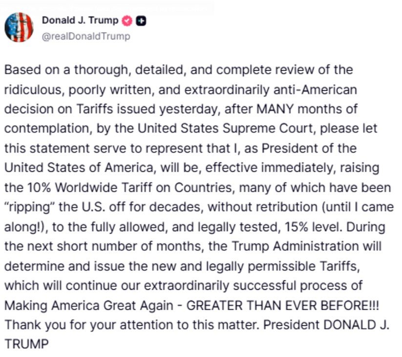 राष्ट्रपति ने अपने बयान में सुप्रीम कोर्ट के फैसले की कड़ी आलोचना करते हुए कहा, कल सुप्रीम कोर्ट द्वारा टैरिफ पर दिए गए घटिया और अमेरिका विरोधी फैसले की समीक्षा के बाद, मैं राष्ट्रपति के रूप में वैश्विक टैरिफ को 10% से बढ़ाकर कानूनी रूप से मान्य 15% करने की घोषणा करता हूँ।